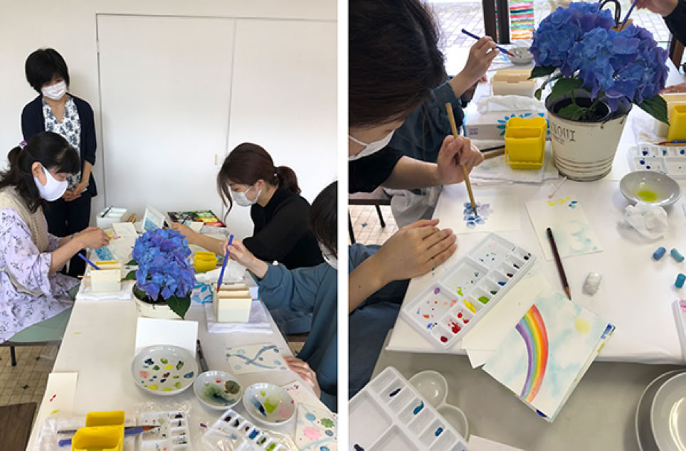 紫陽花など季節の花を描いたあと、自由なテーマに取り組みました。