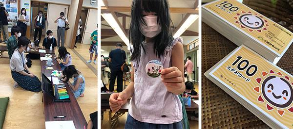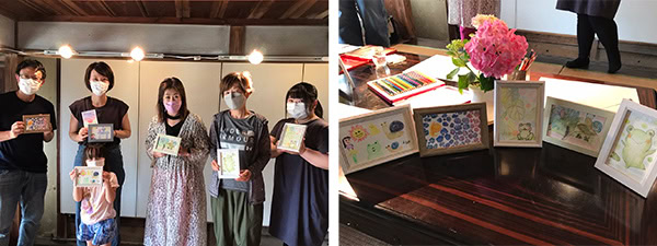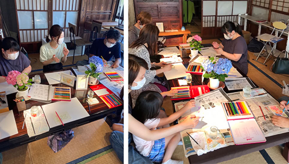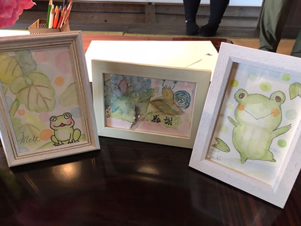 参加者の皆さまに、水彩色鉛筆で紫陽花やカエルなど、季節を感じるモチーフを思い思いに描いていただきました。