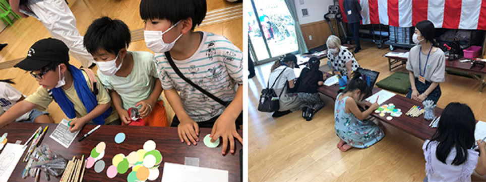 皆さん、使うことを想像しながら、模様や魚、夏野菜などの絵を描かれ、2時間で3〜4枚出来上がりました。