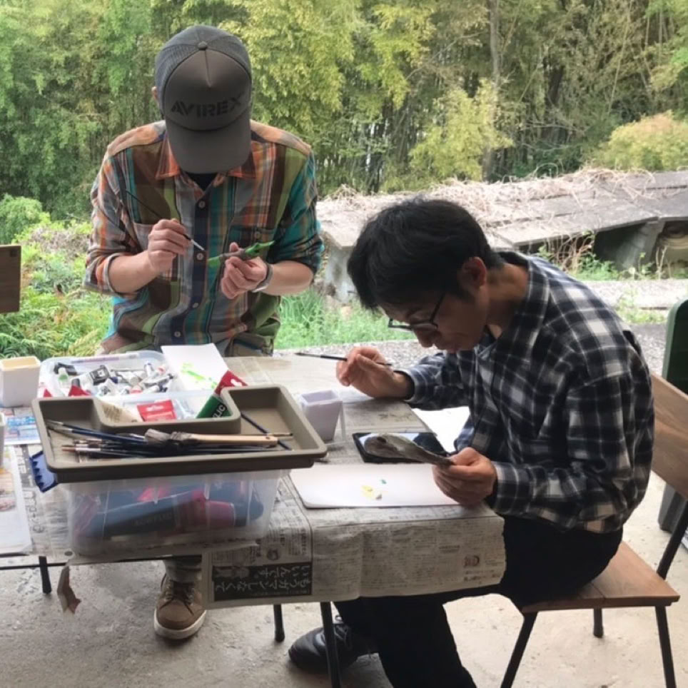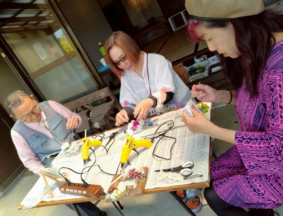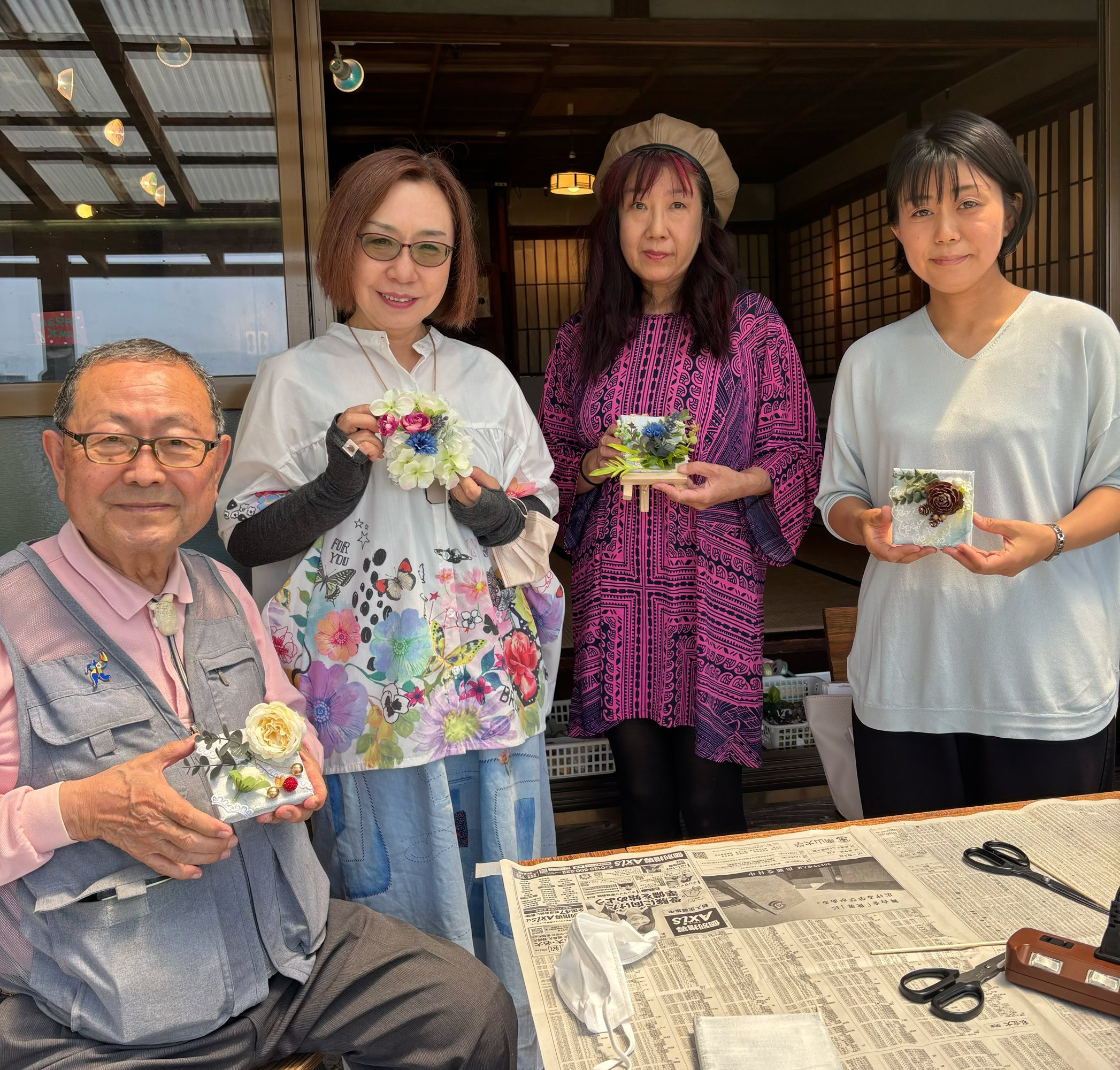 5月の爽やかな陽気の中、崖の上ギャラリーのテラスにて、ミニキャンバスのアレンジメントを制作しました。