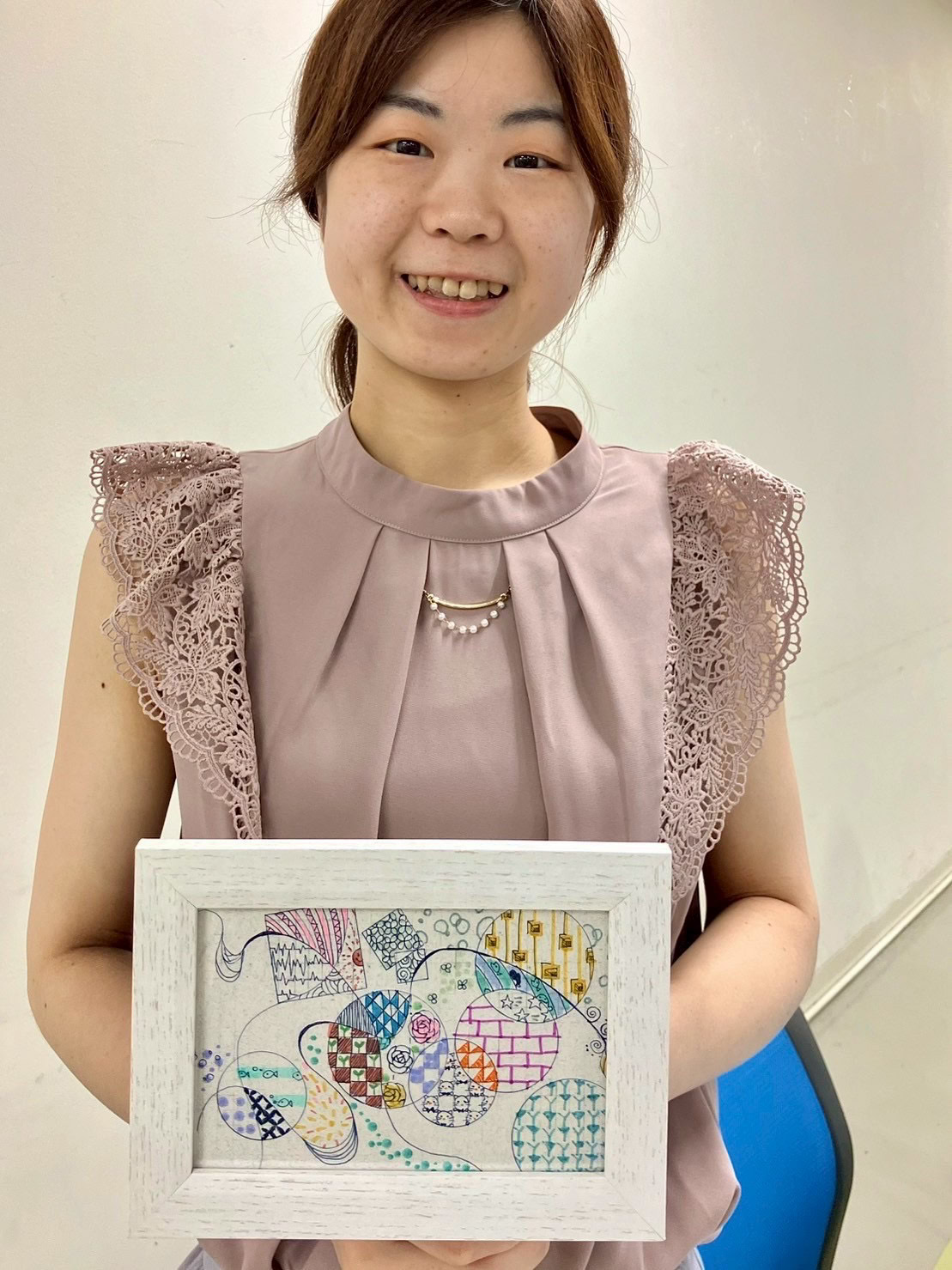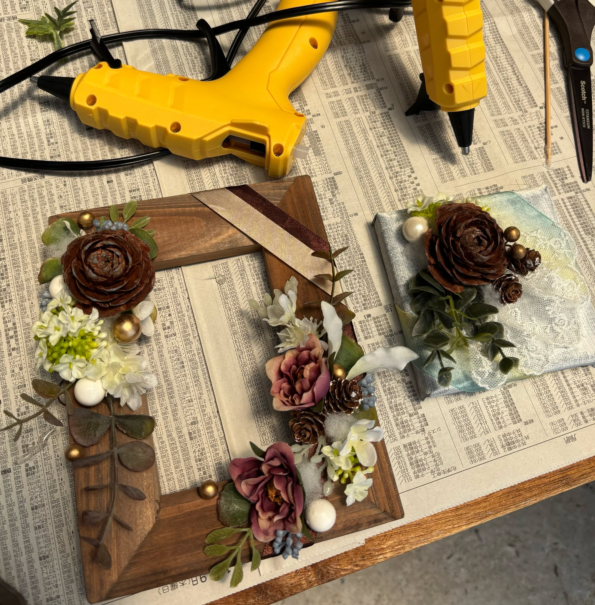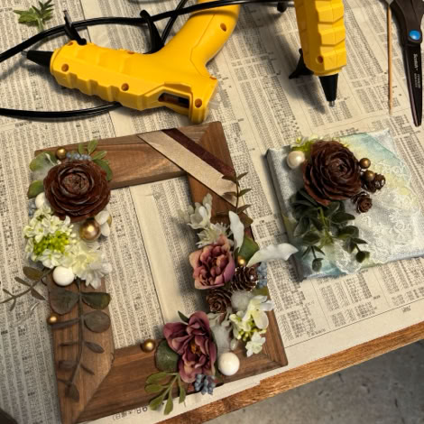 そして、グルーガンを使って一つひとつ丁寧にキャンバスへ貼り付けていき、、、素敵な作品が出来上がりました。