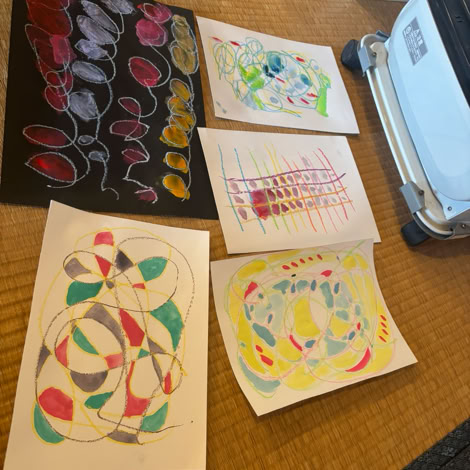 具象と抽象の違い、抽象画の生まれたキッカケなど簡単にお話させていただいた後、パステルや絵の具、コンテを使って制作しました。