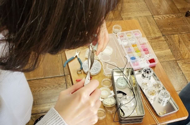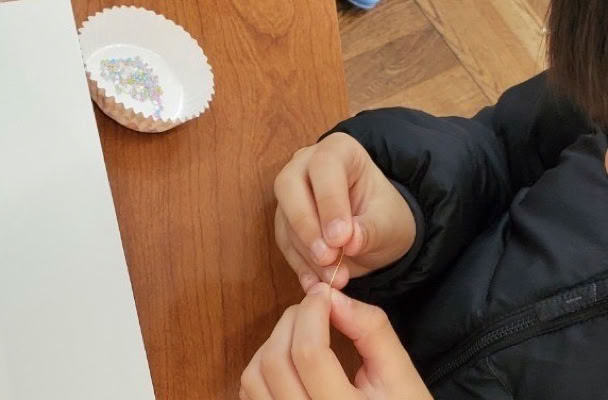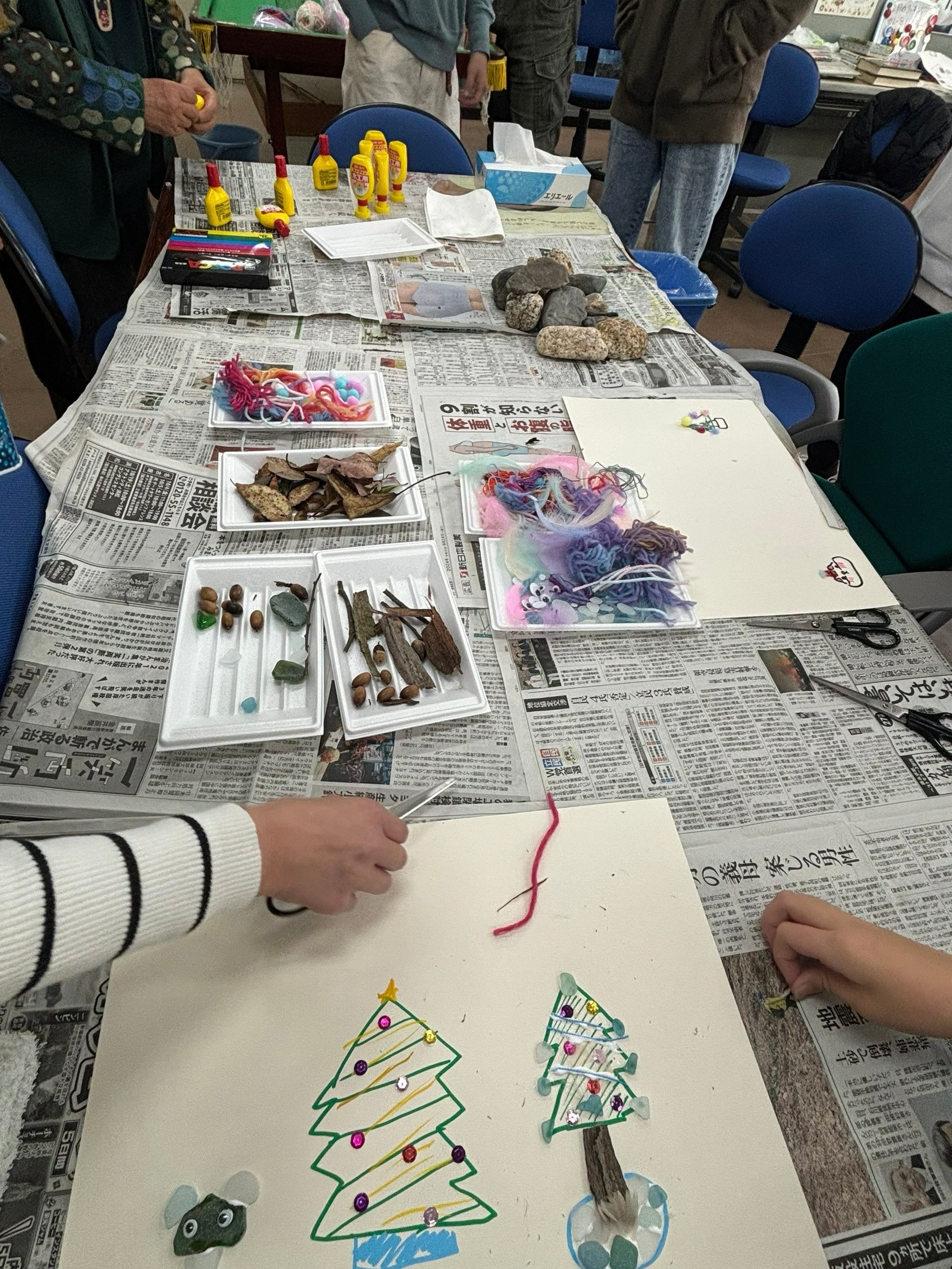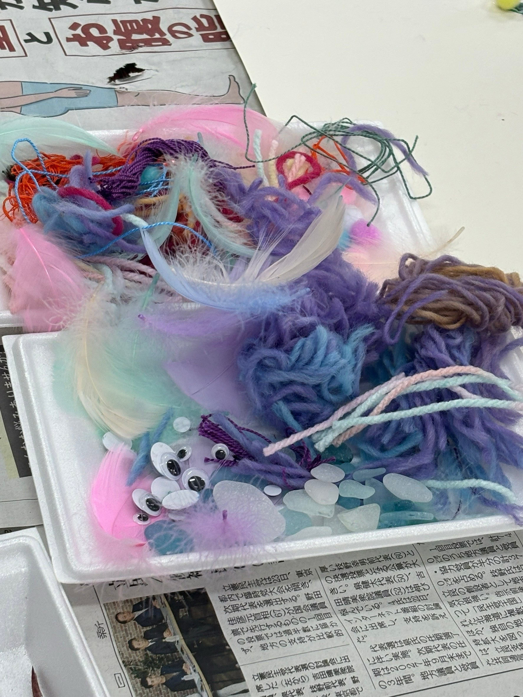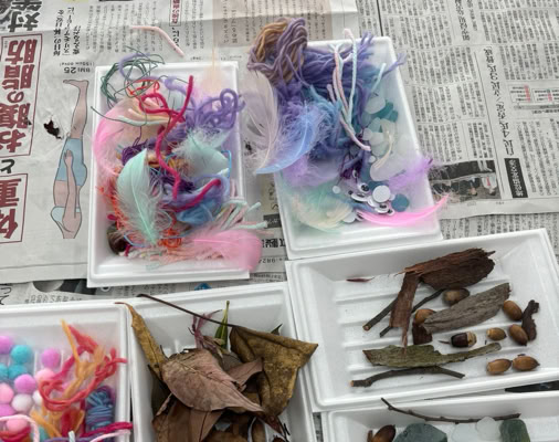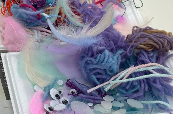 鳥の羽、毛糸、ビーズ、フェルト、シーグラスなど思い思いの素材をくっつけて完成です!