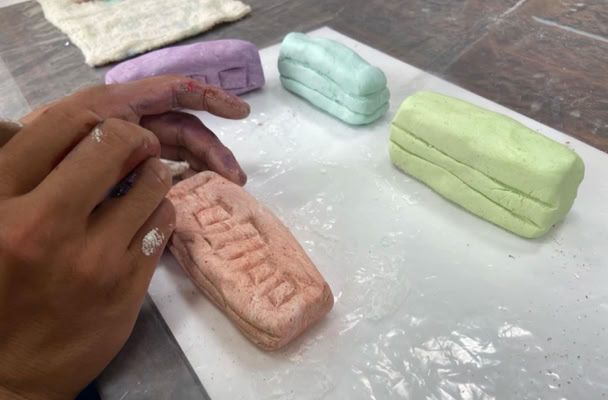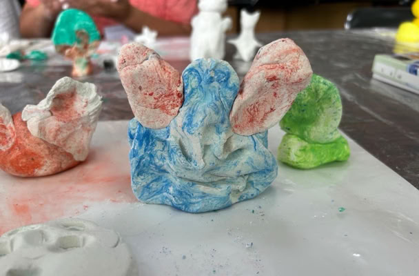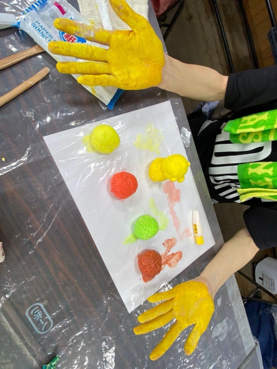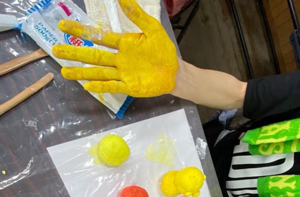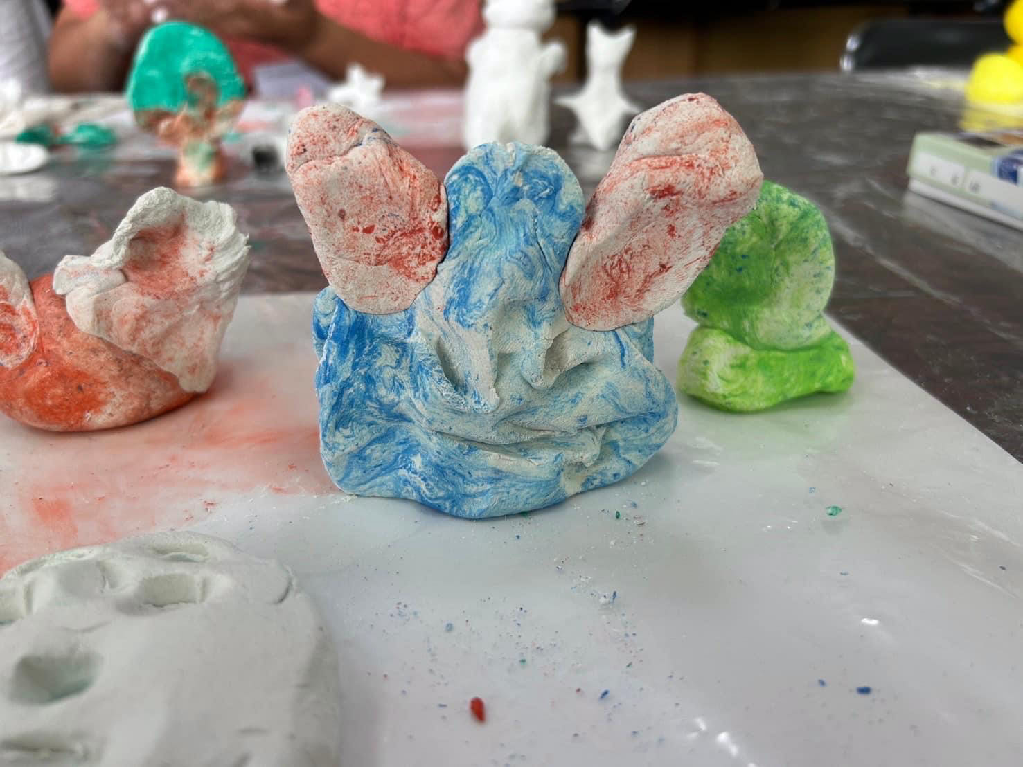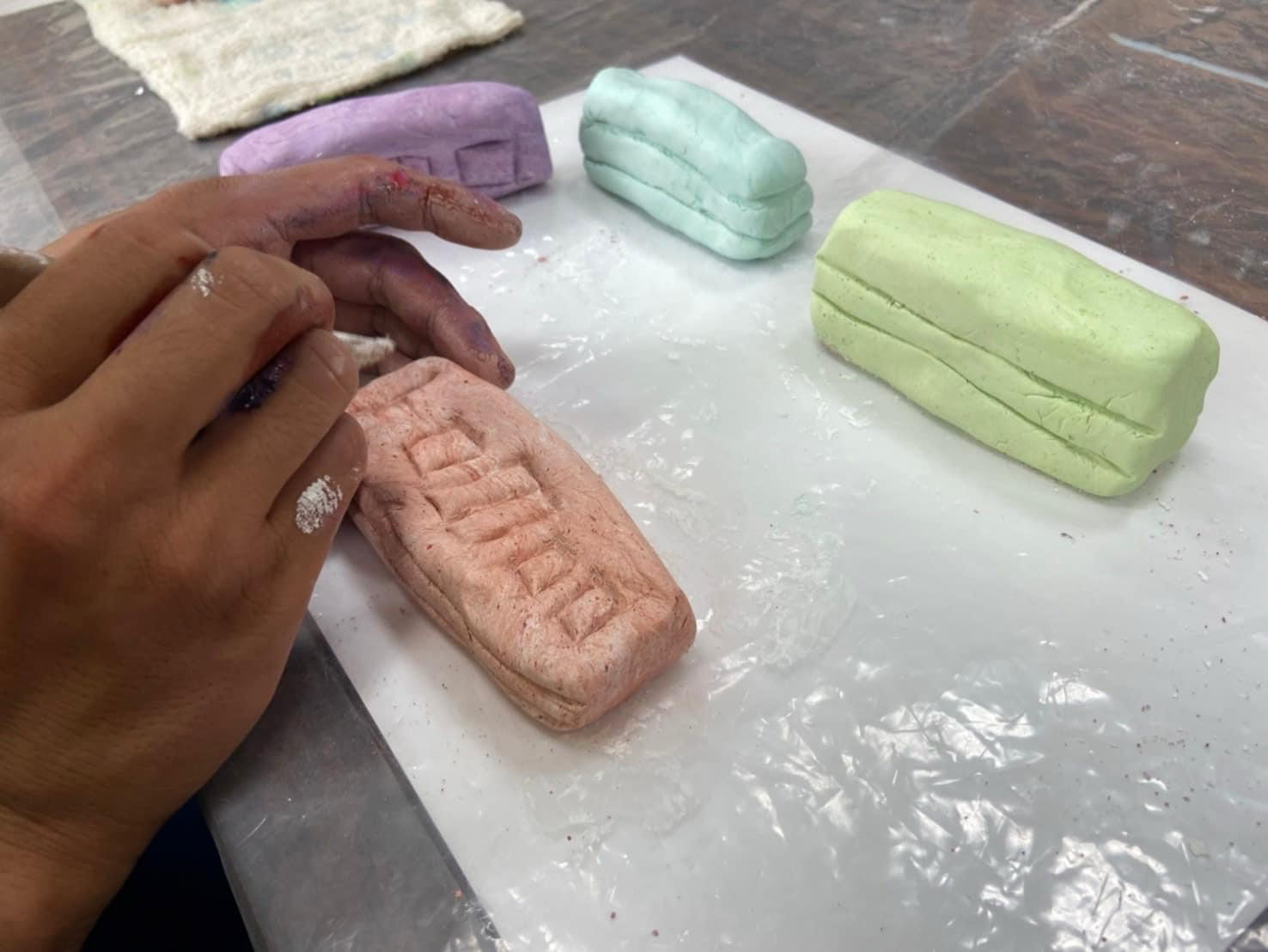 真っ白な紙粘土に絵の具を混ぜて、よく捏ねて。