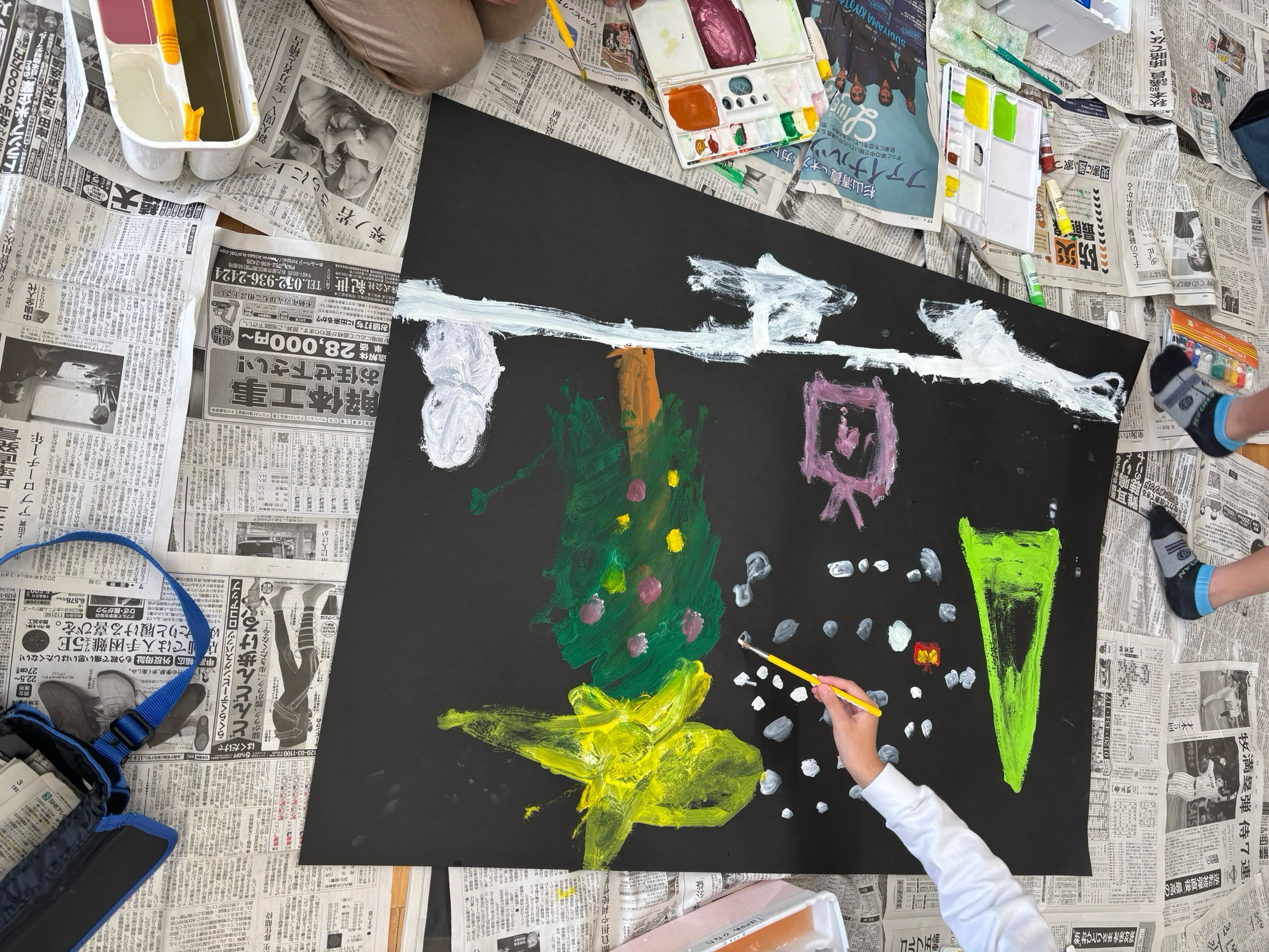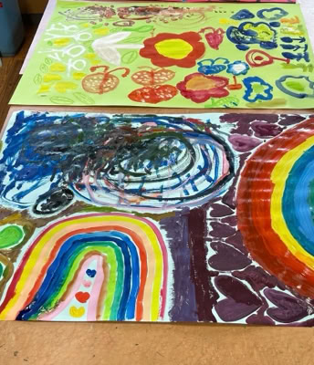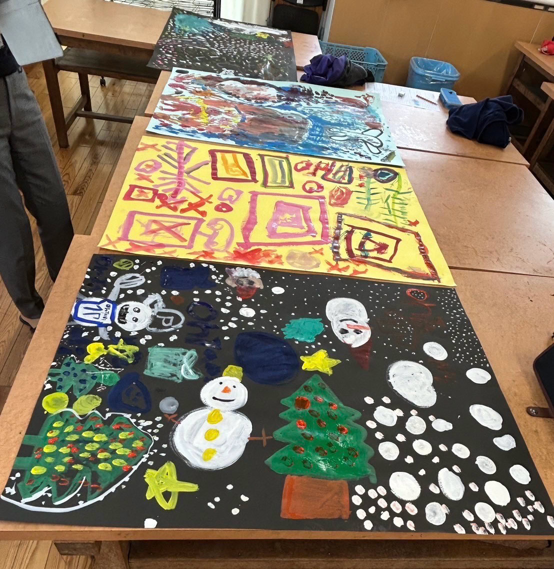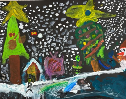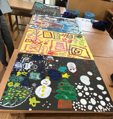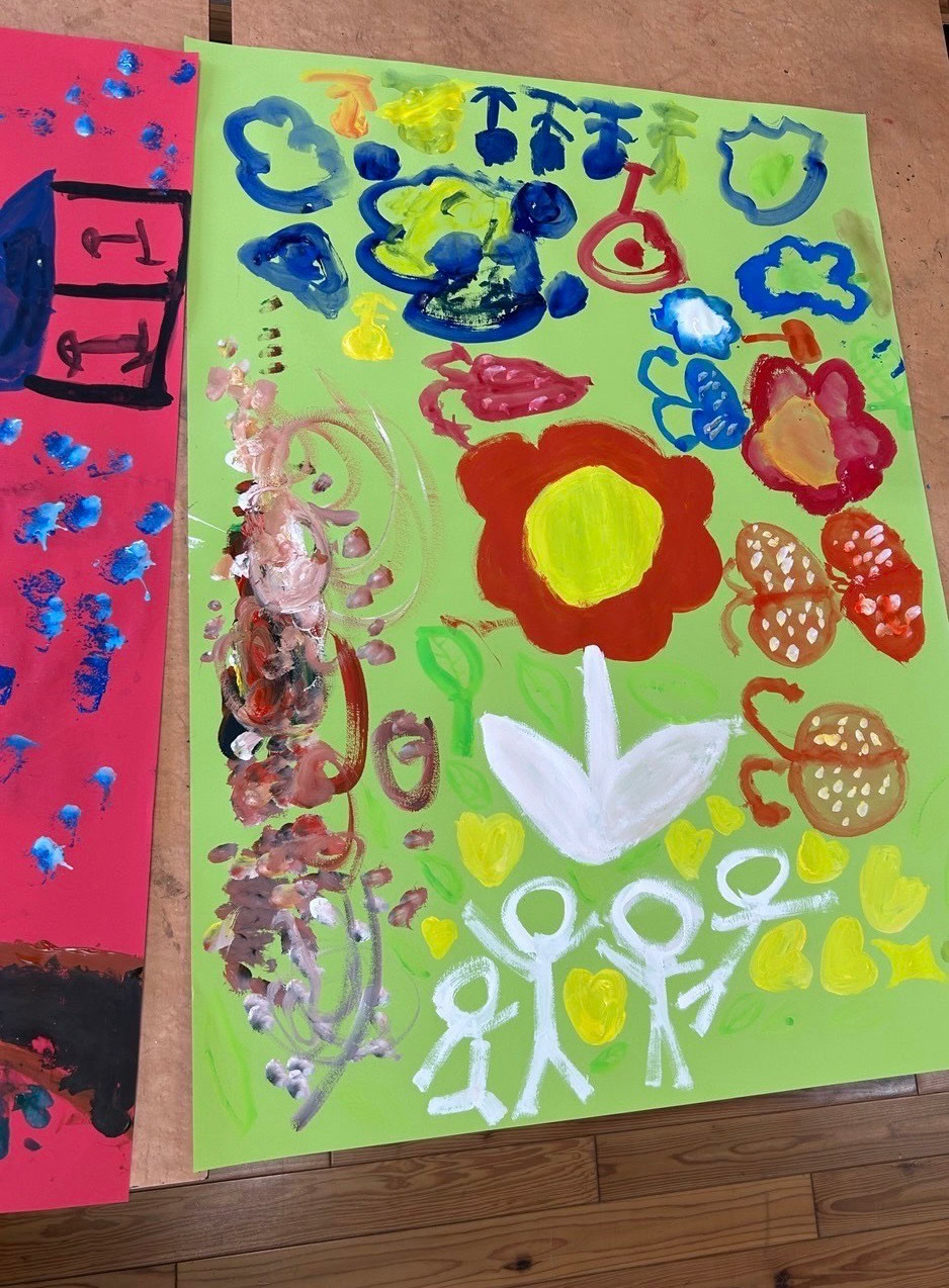 クリスマス、お花畑、虹など自由自在に描き始めて、、、カラフルで愛らしい作品が出来上がりました。「楽しかった」「また来てね」と言っていただき嬉しかったです。
