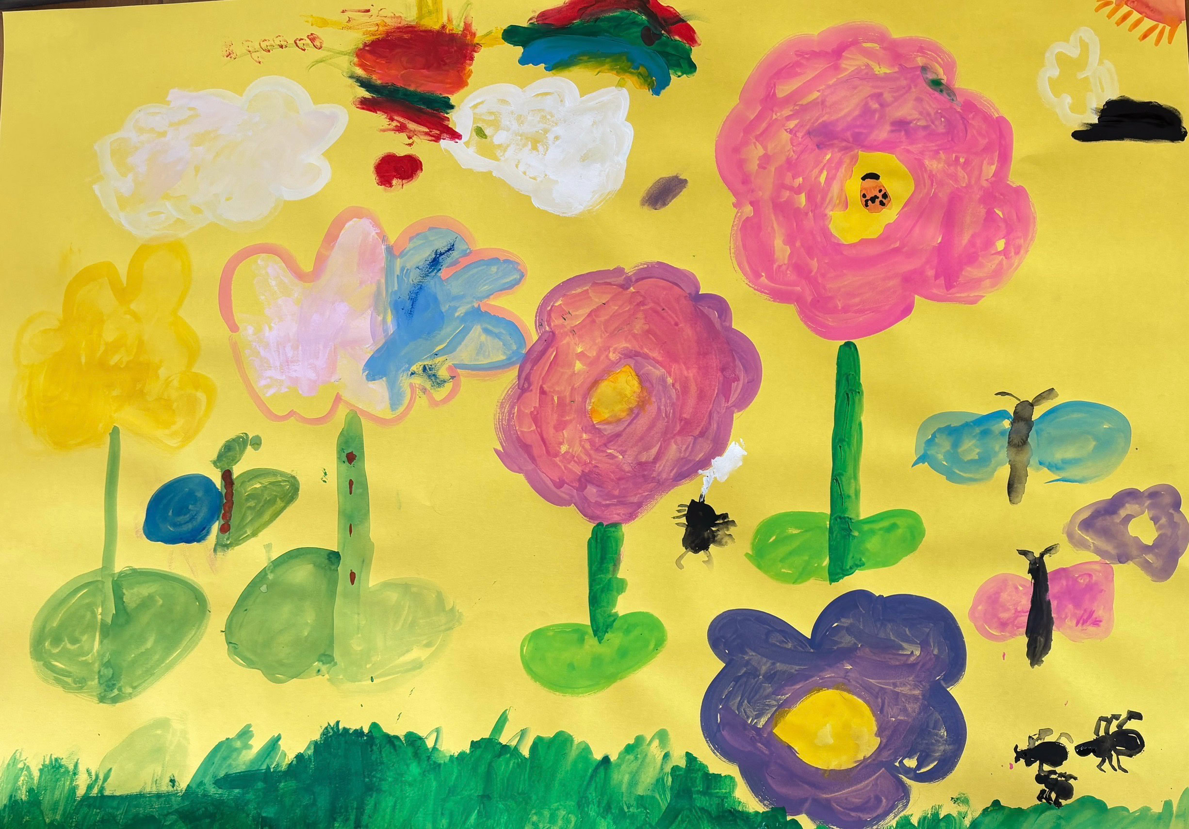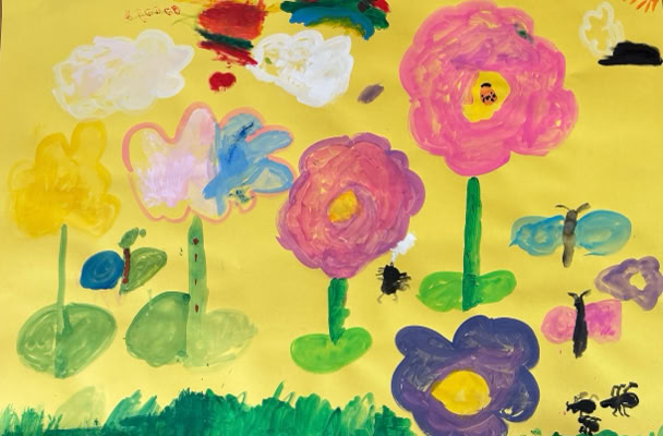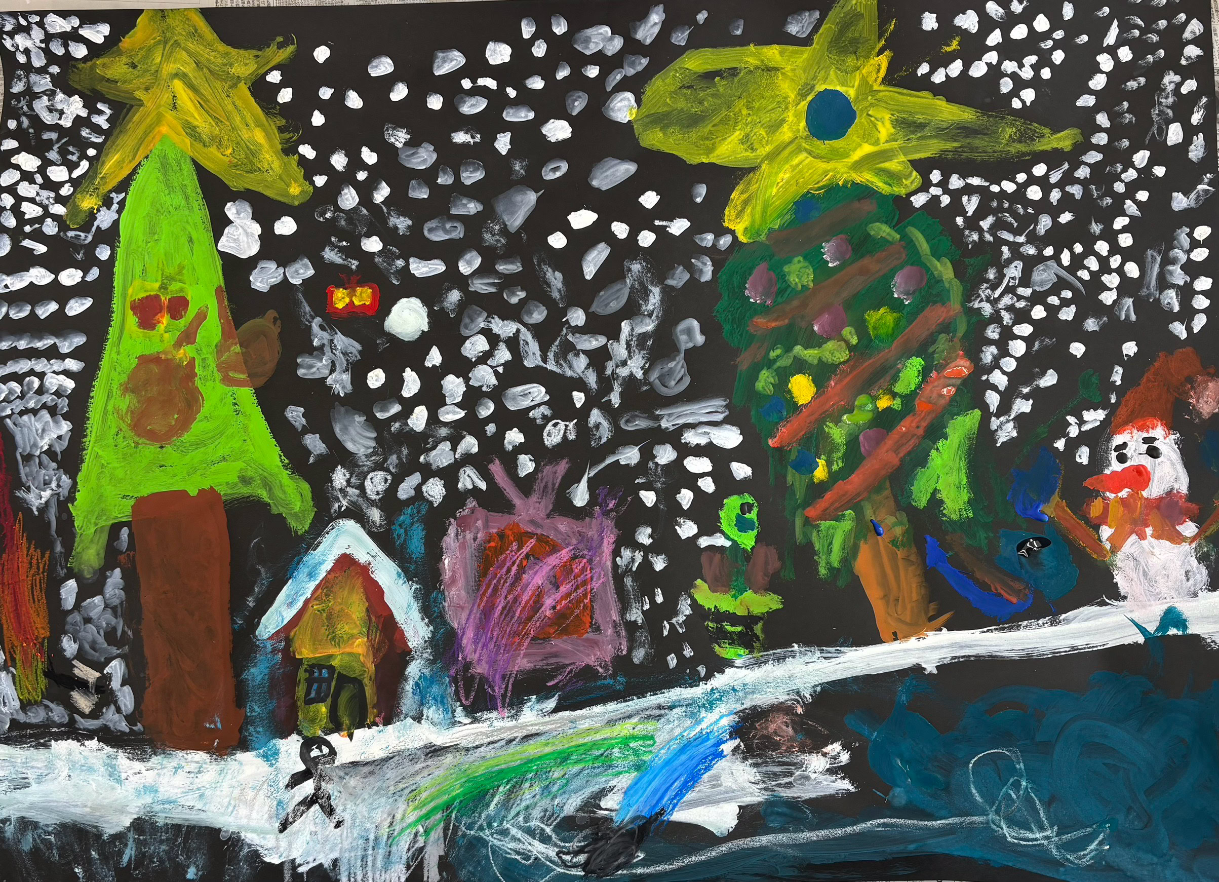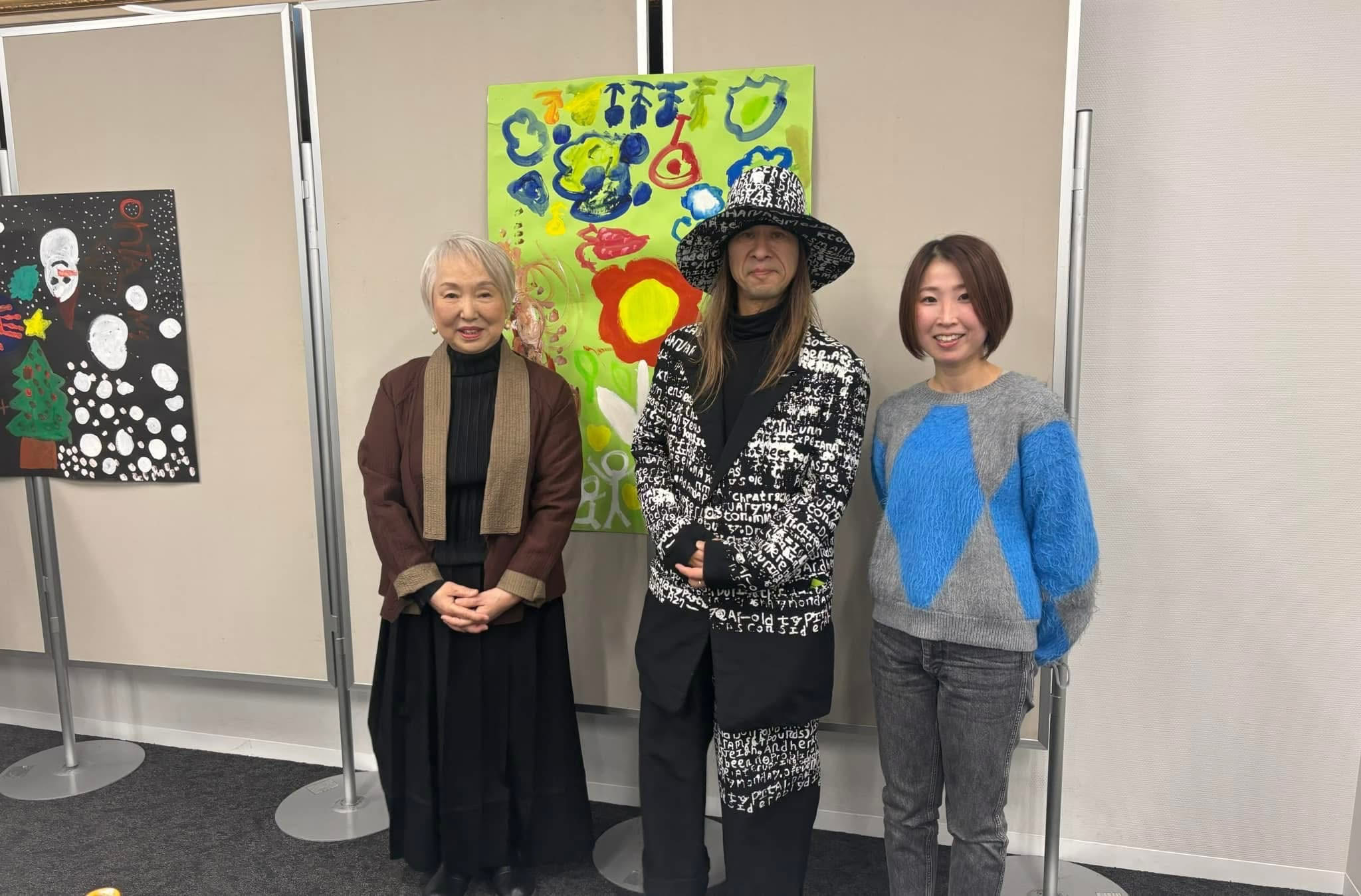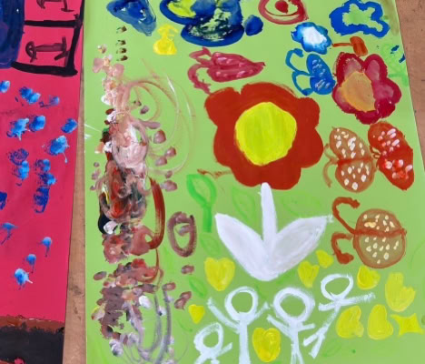 クリスマス、お花畑、虹など自由自在に描き始めて、、、カラフルで愛らしい作品が出来上がりました。「楽しかった」「また来てね」と言っていただき嬉しかったです。