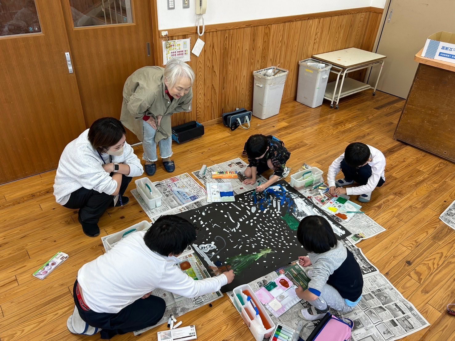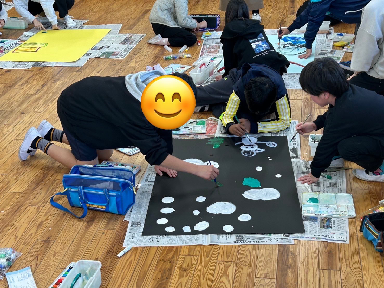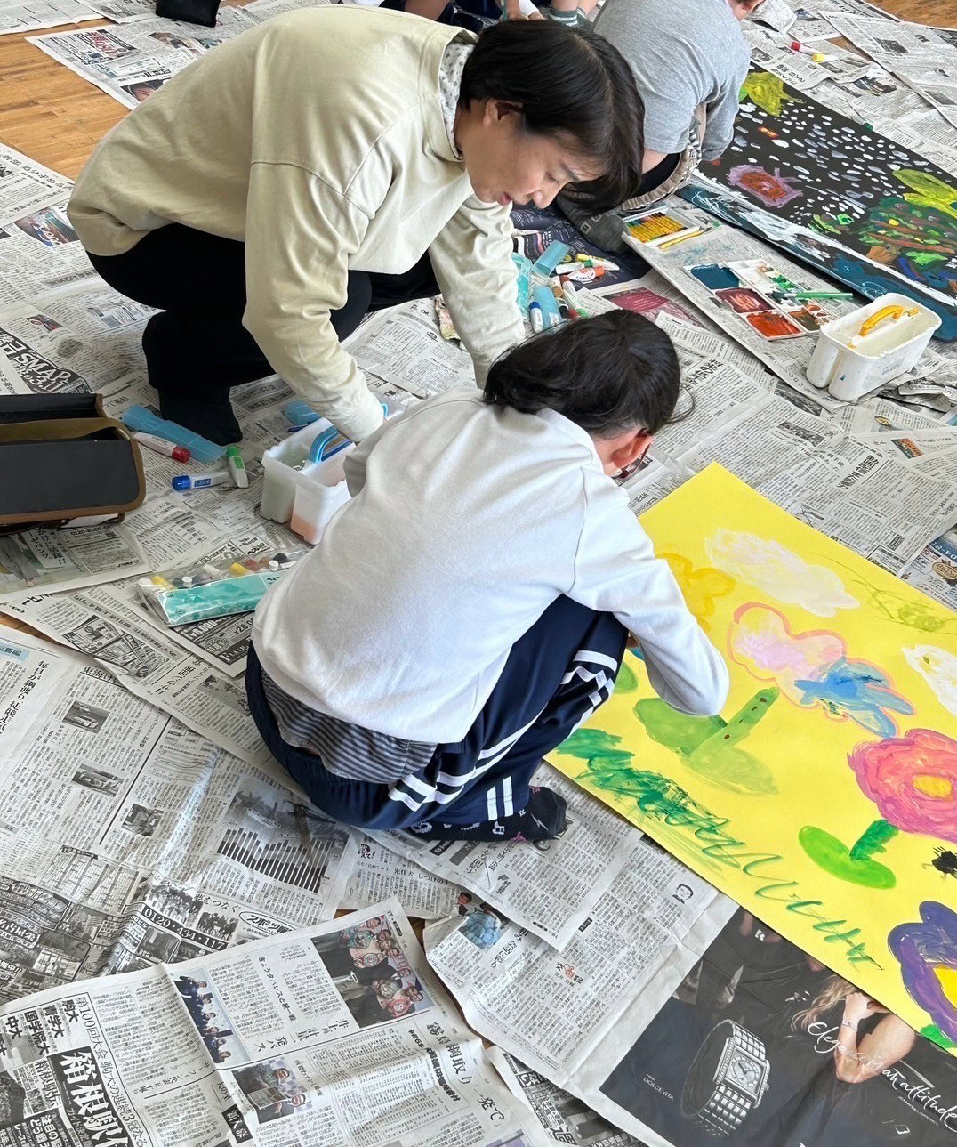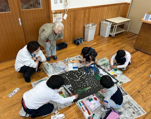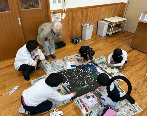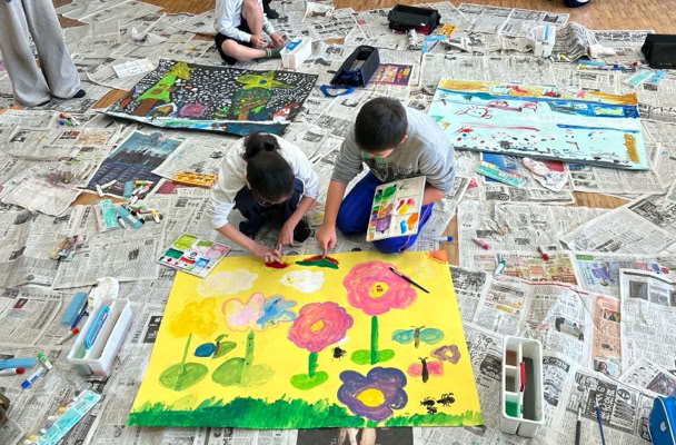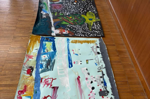 好きな色の画用紙に集まった子どもたちは相談しながら絵のテーマを決めて、絵の具でどんどん描いていきました。