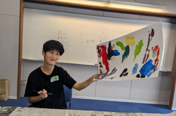 白い画用紙を前にして、初めは戸惑っていた皆さんも、パレットに数色の絵の具を出して筆を持った途端、グイグイと描き始めてくださいました。